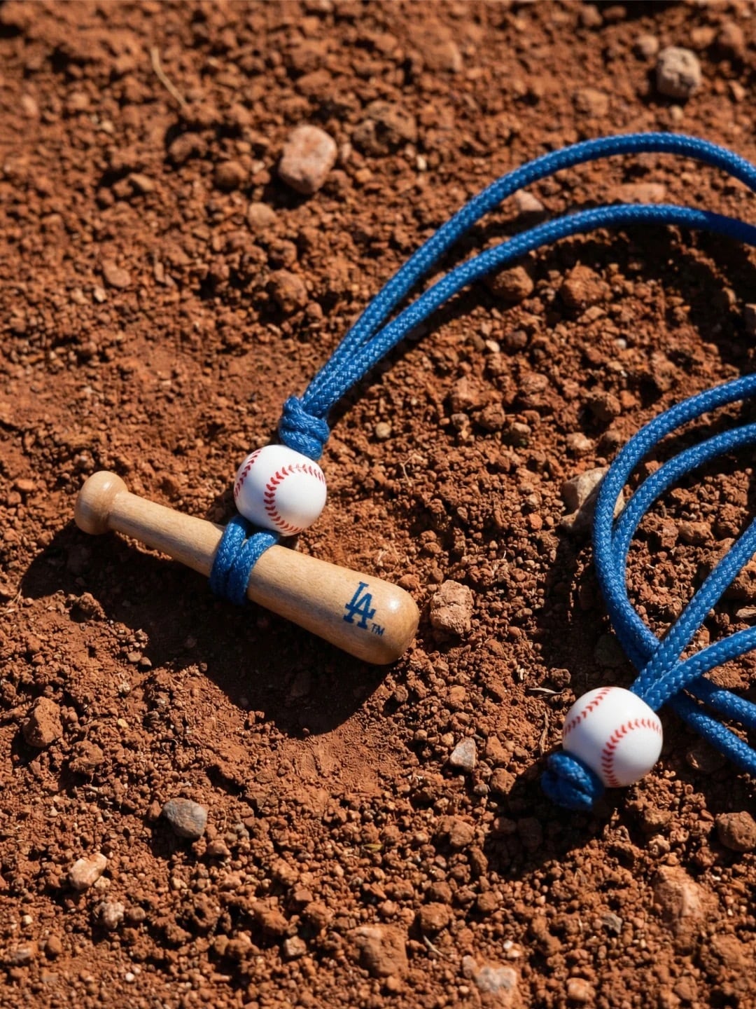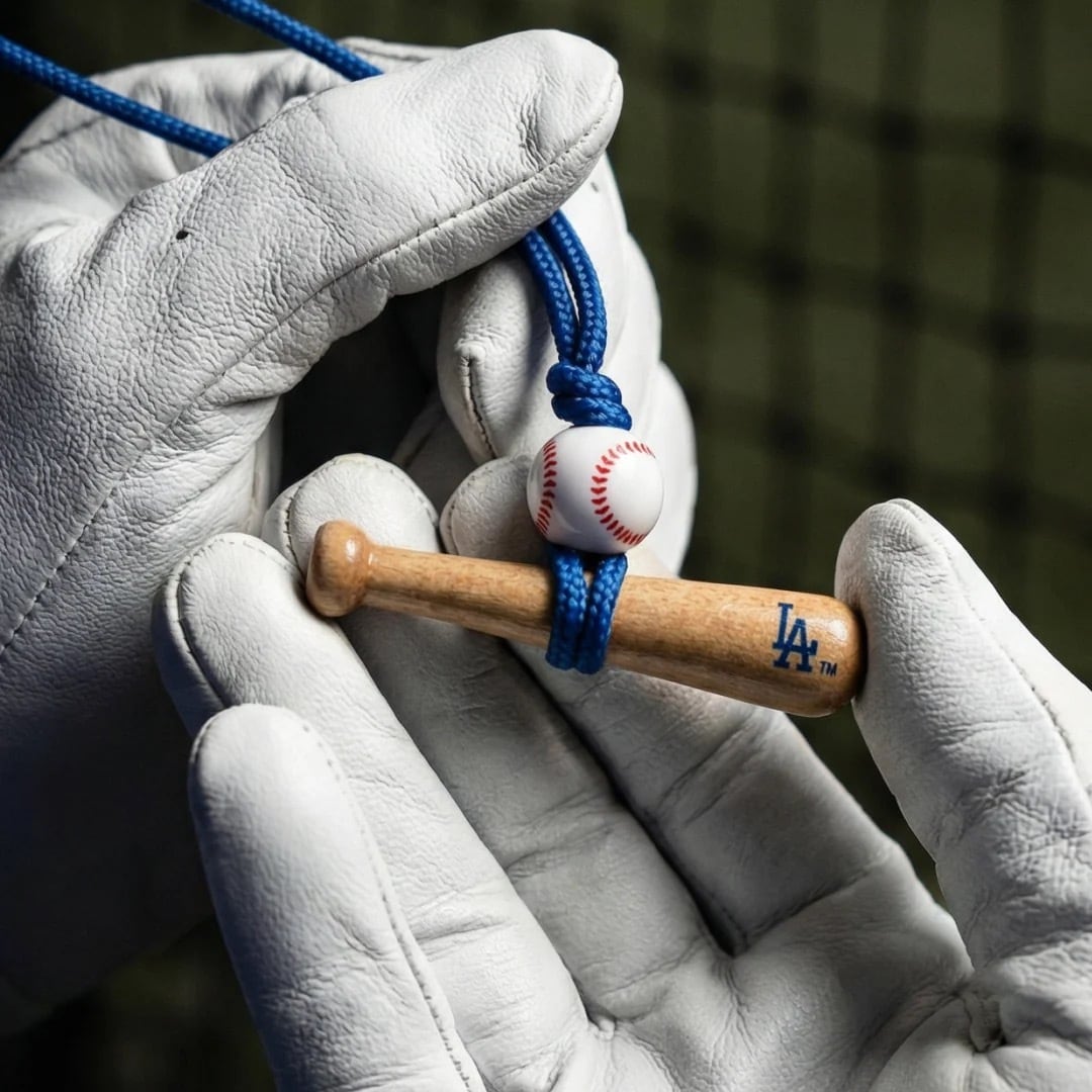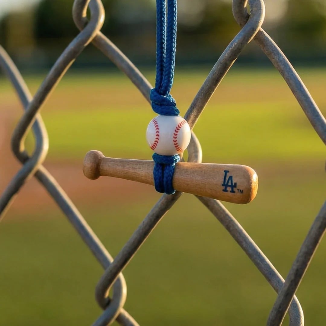 ロサンゼルス・ドジャースの象徴である「LA」ロゴをあしらったミニバットと、野球ボールのビーズがアクセントになった、ファン必携のアイテムです。