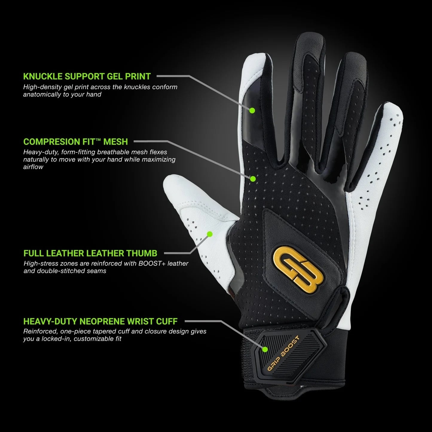 手首から指先まで、BOOST+レザーグリップテクノロジーを採用したGrip Boostバッティンググローブは、業界最高峰のフィット感、精密に設計されたグリップ、そして第二の皮膚のような感触を提供します。ぜひお試しください。あなたの手とスイングにきっとご満足いただけるはずです。