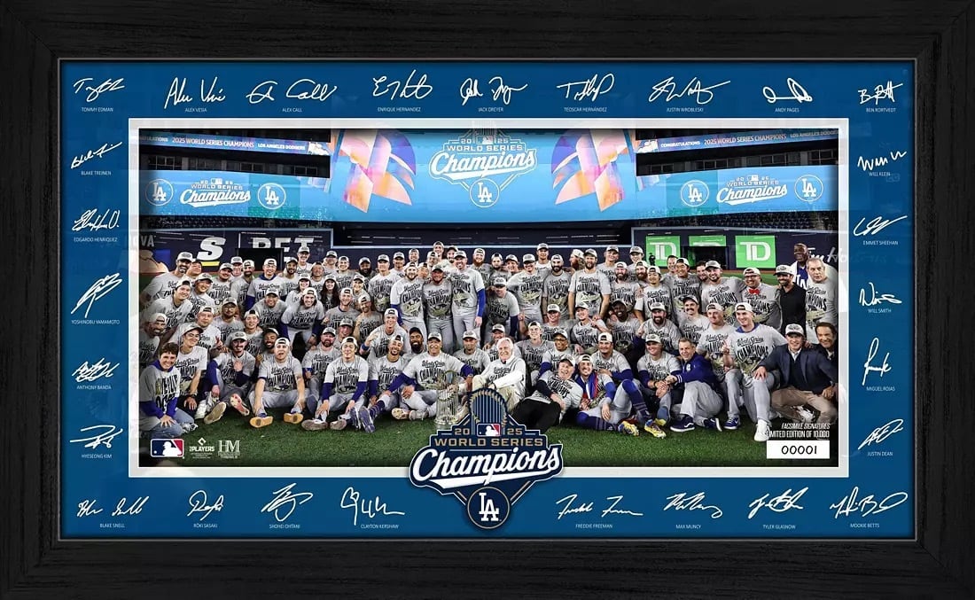 2025年ワールドシリーズ優勝チームを祝う、限定版記念フレームが登場!この12インチ×20インチのフレームには、ワールドシリーズ優勝後のグラウンドで選手たちが歓喜する様子を捉えた10インチ×18インチの限定プリントがプレキシガラスの下に収められています。プリントには、選手全員のレプリカ(複製)サインが周囲に配置されています。このユニークなコレクターズアイテムは限定10,000個のみの販売で、MLBおよびMLBPAの公式ライセンス商品です。ハイランドミント社がアメリカ国内で誇りを持って製造しています。