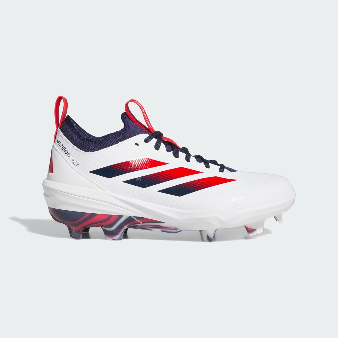 スピードと快適さを高次元で融合させた、アディダスUSA限定モデル。 星条旗をイメージしたトリコロールカラーが目を引く「Adizero Impact TPU 2.0」は、軽さを武器にする全てのプレーヤーのために設計されました。アディダス独自のLightstrikeミッドソールが、次の一歩をより速く、より力強くサポートします。