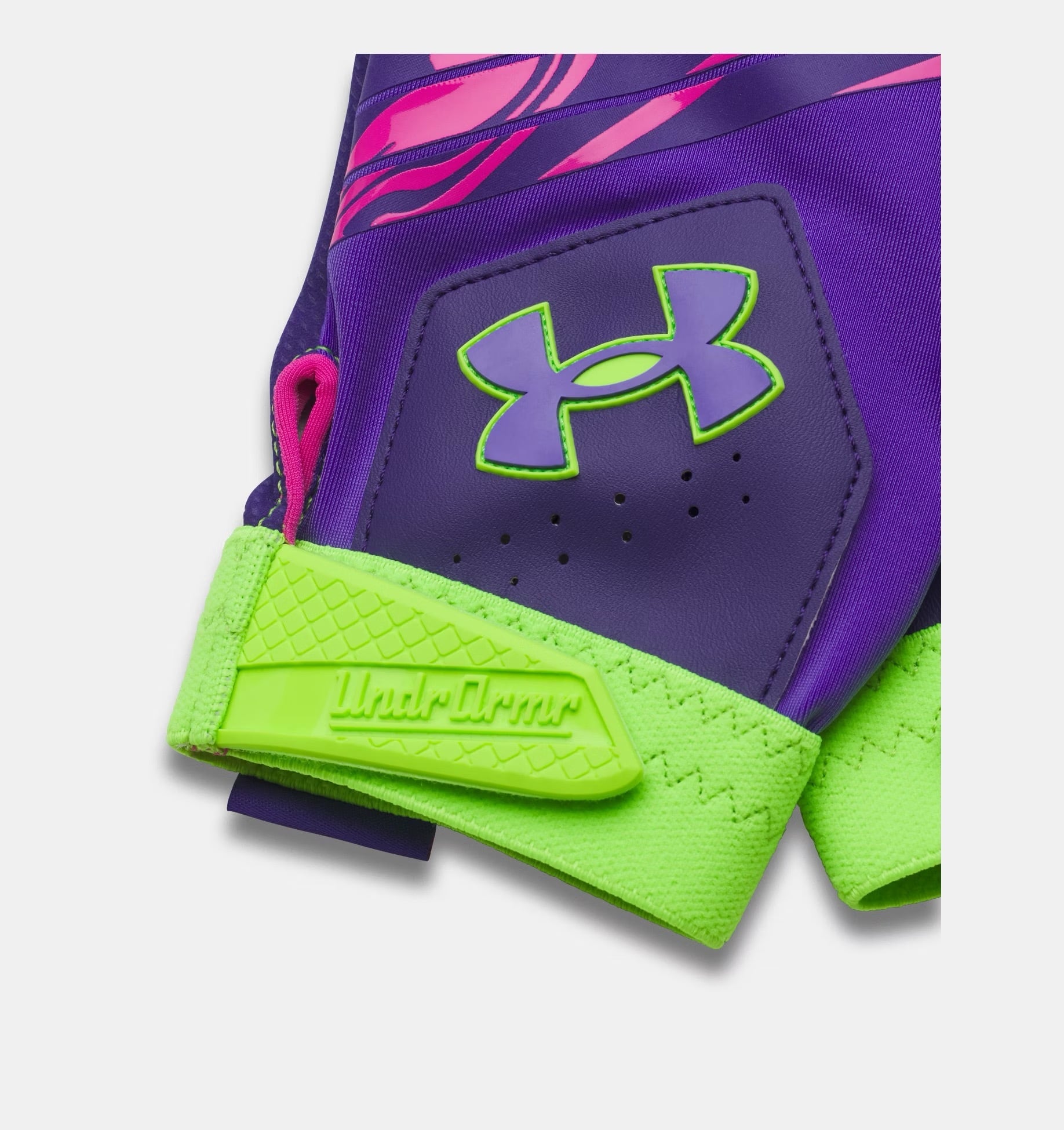 鮮やかなバイオレットとハイパーグリーンの組み合わせが、バッターボックスでの存在感を際立たせます。