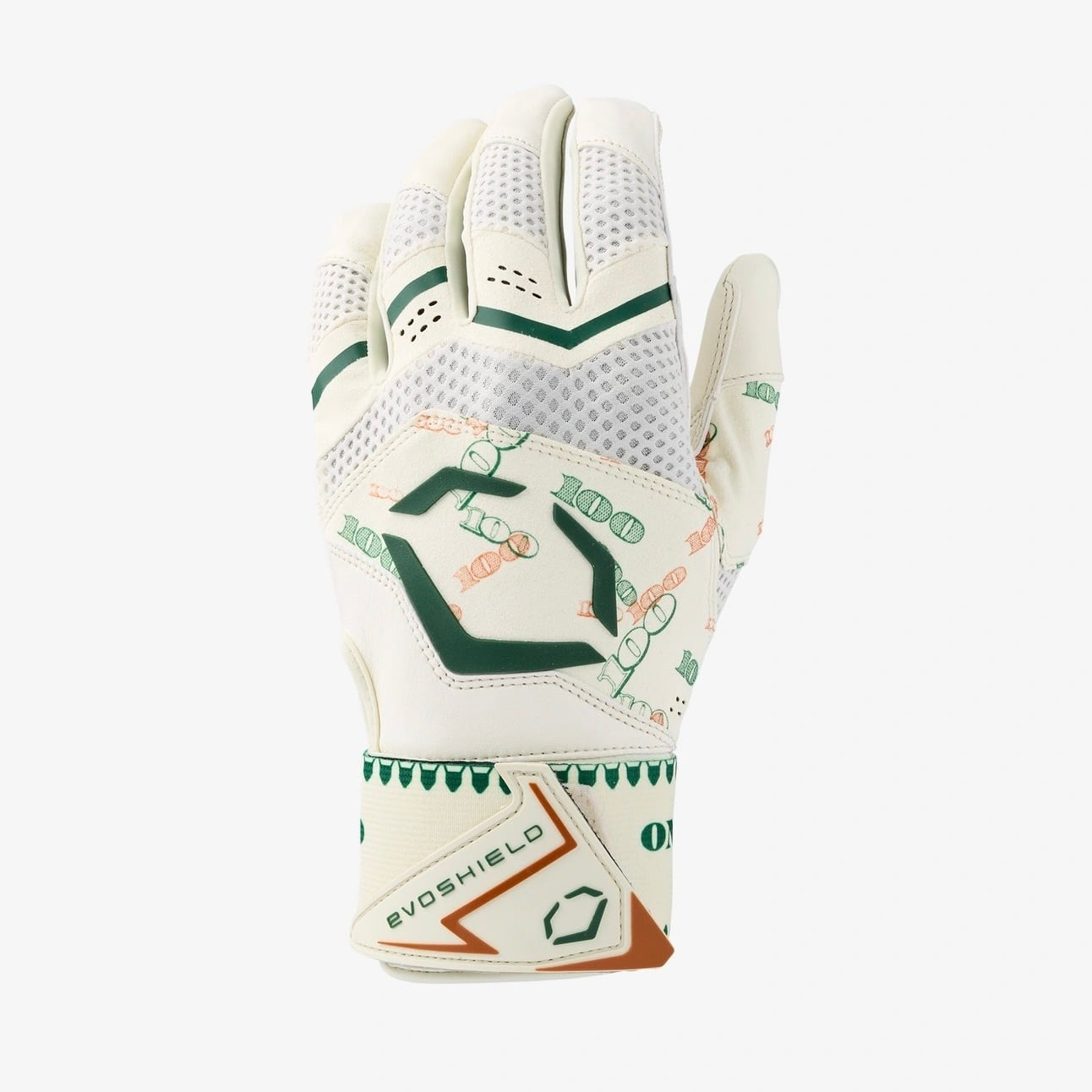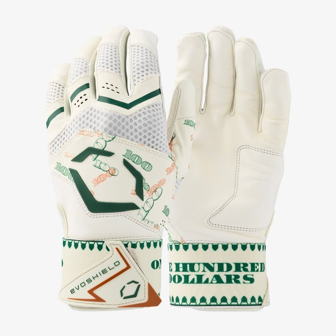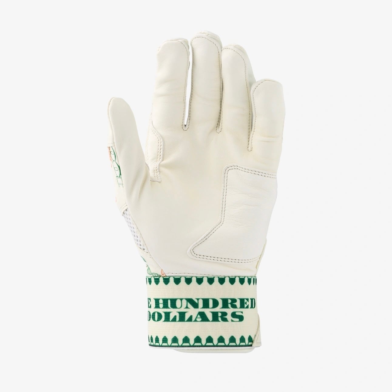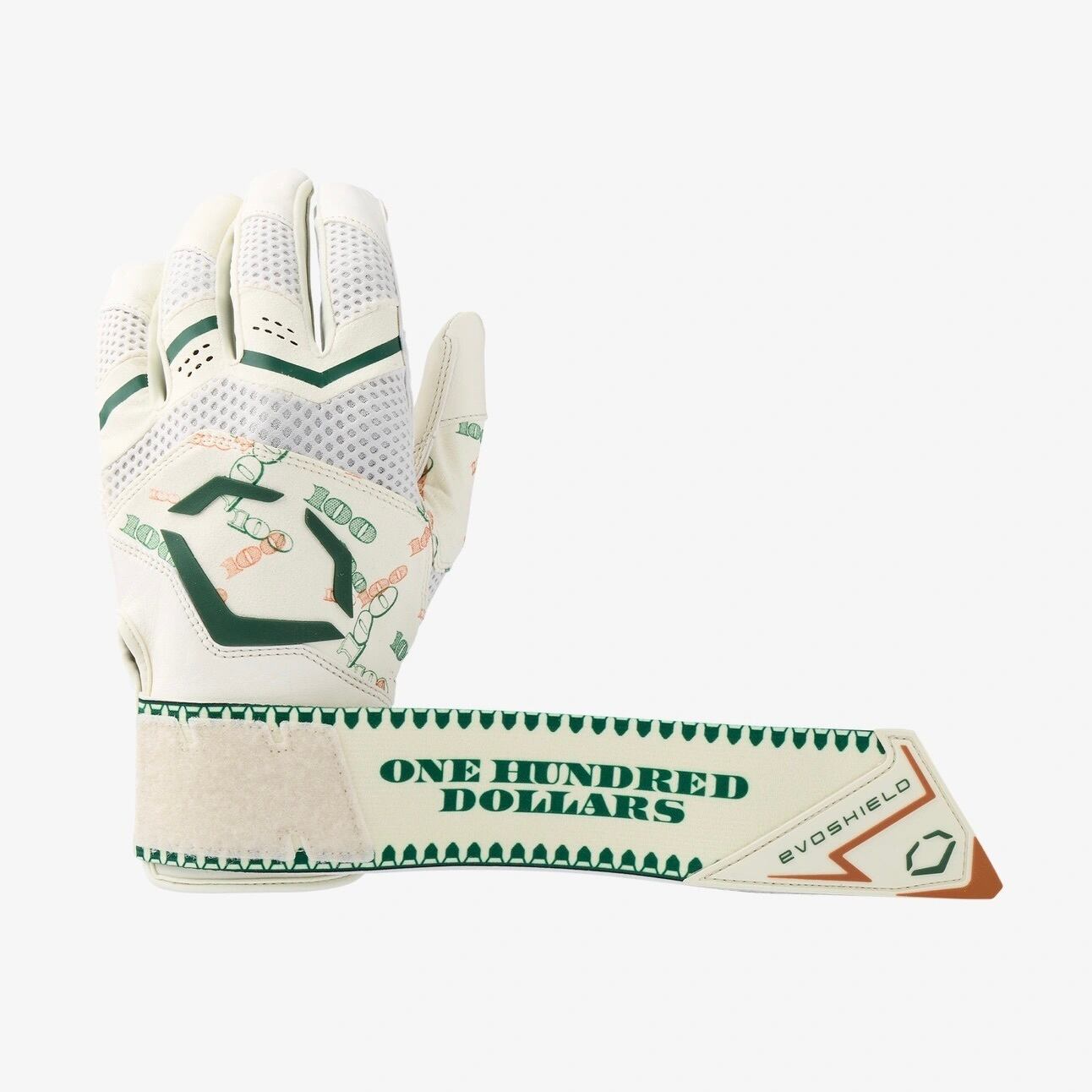 「打席で富と勝利を掴め。最高級カブレッタレザーを採用した100ドル札デザイン・グローブ。」