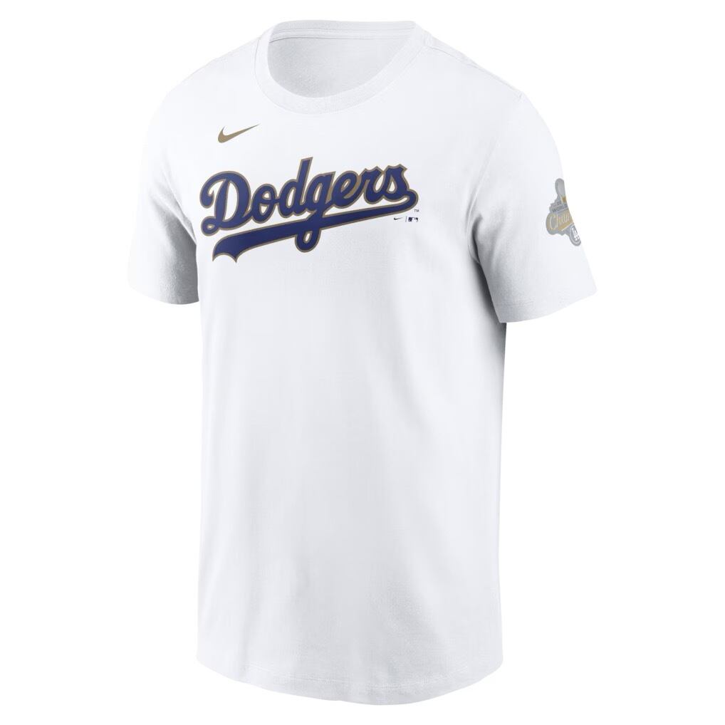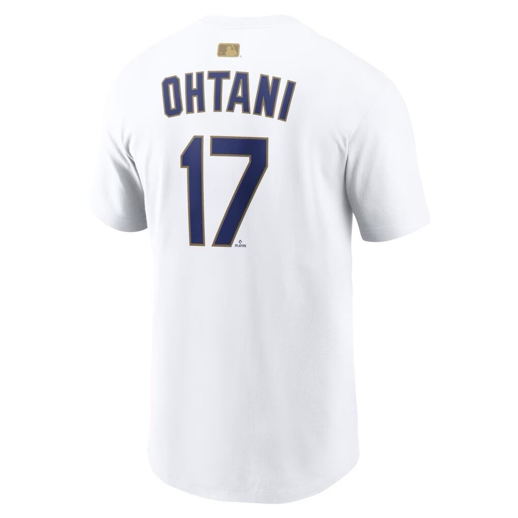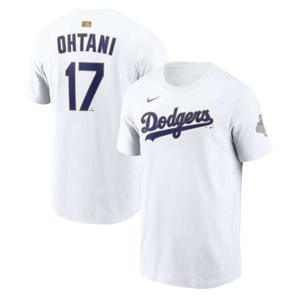 ロサンゼルス・ドジャースの2025年ワールドシリーズ優勝を記念してリリースされた、Nike製「2026 ゴールド・コレクション」のネーム&ナンバーTシャツ。